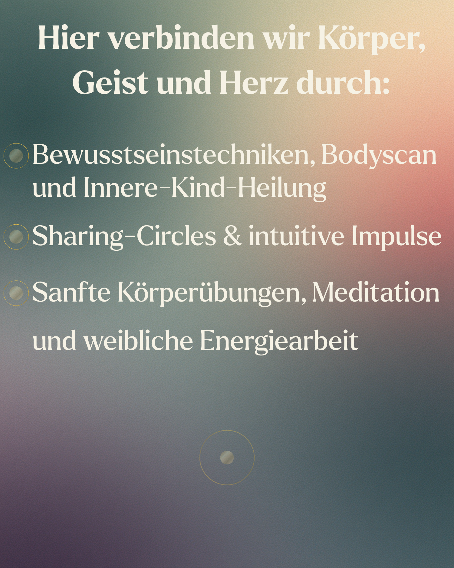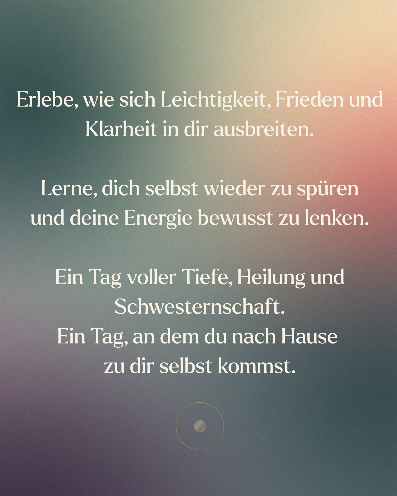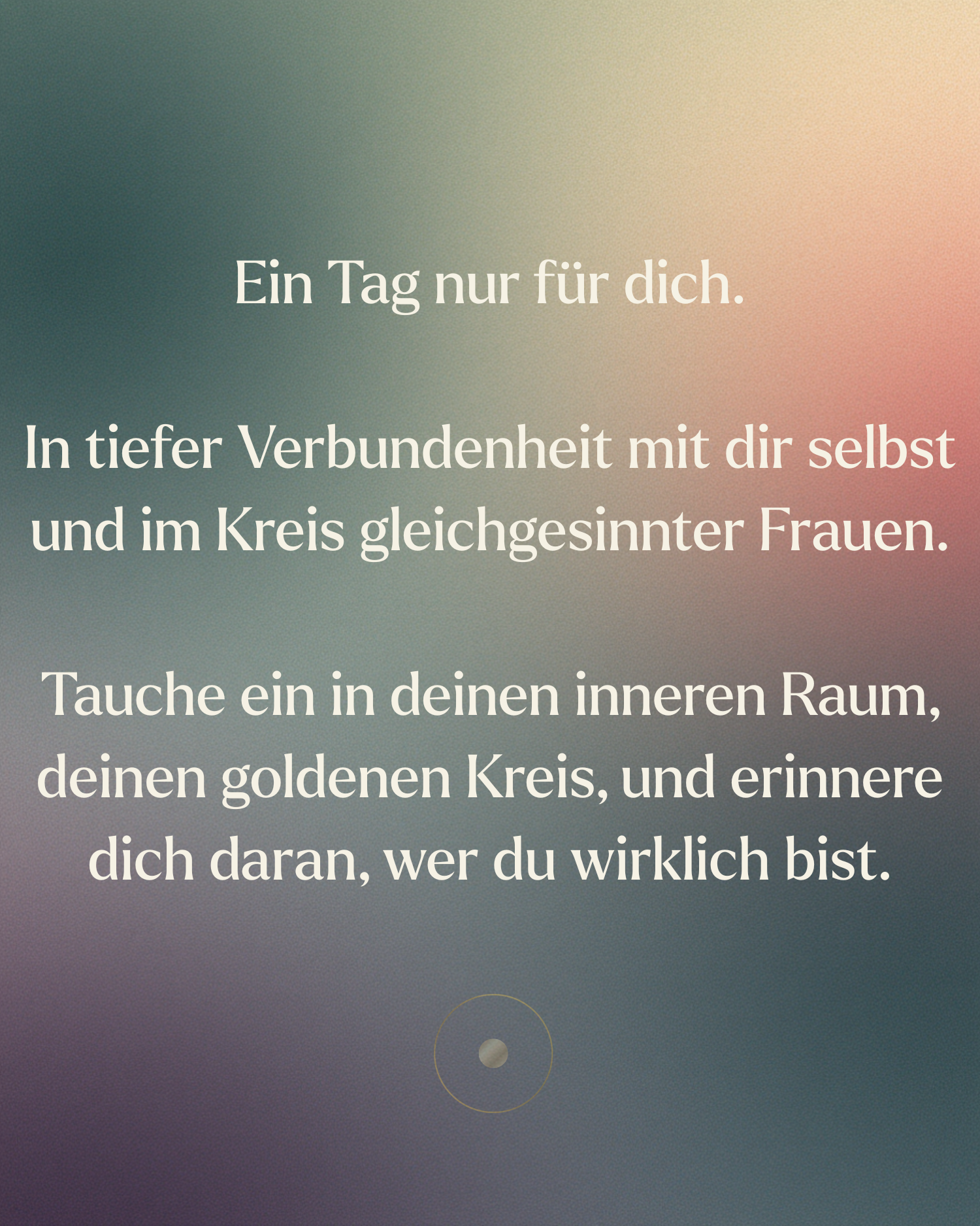 Ein Tag nur fĂĽr dich. In tiefer Verbundenheit mit dir selbst und im Kreis gleichgesinnter Frauen. Tauche ein in deinen inneren Raum, deinen goldenen Kreis, und erinnere dich daran, wer du wirklich bist.